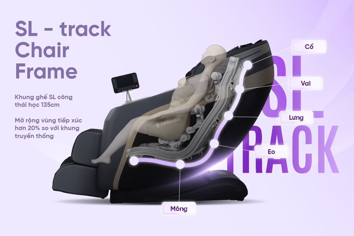T59 sở hữu khung SL-track dài 135cm, được thiết kế theo nguyên lý công thái học, ôm sát đường cong từ cổ - vai - lưng - eo - đùi. Khung SL cũng được nhận định là một trong những thiết kế đường ray con lăn tân tiến nhất hiện nay, có khả năng mở rộng vùng tiếp xúc hơn 20% so với khung truyền thống, giúp con lăn tiếp cận trọn vẹn các vùng thường đau mỏi và tăng hiệu quả massage trị liệu tại các huyệt đạo trọng điểm.