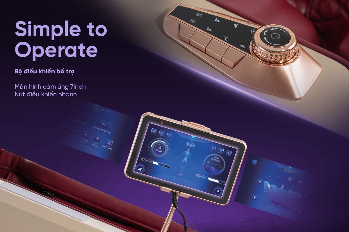 Luxury Legend đồng thời cũng được bổ sung thêm màn hình cảm ứng 7 inch, giao diện tiếng Việt trực quan, đi kèm nút điều khiển nhanh, hỗ trợ thao tác mượt mà. Nhờ đó, người dùng có thể thỏa sức điều chỉnh các bài tập và tăng giảm cường độ matxa ngay khi nằm matxa, không gây gián đoạn giây phút thư giãn.