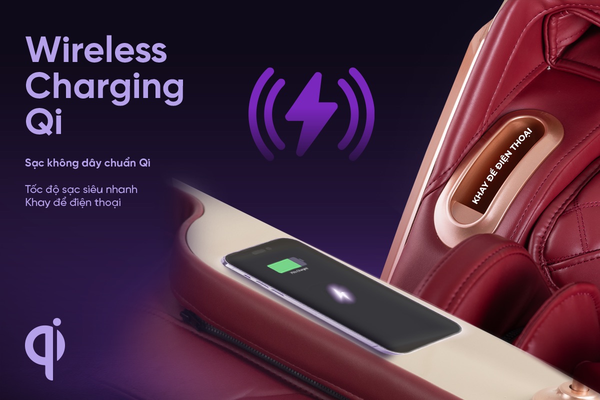 Trên ghế massage Luxury Legend, người dùng có thể tận hưởng nhiều tiện ích nâng cao khác như sạc không dây chuẩn Qi cho tốc độ sạc nhanh tức thì. Đồng thời, ghế cũng trang bị thêm khay để điện thoại, giúp người dùng theo dõi tin nhắn, giải trí tiện lợi trong lúc massage.