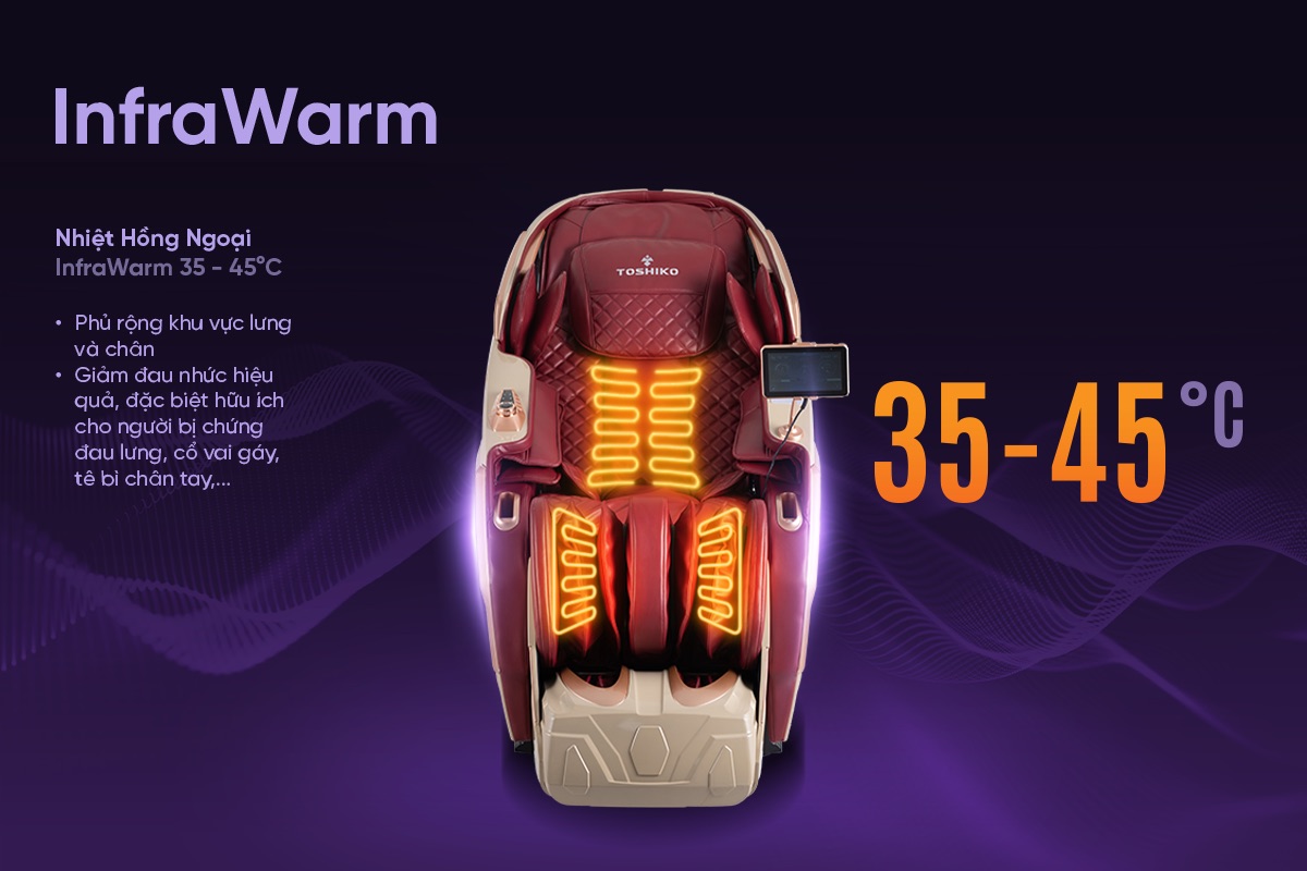 Với dải nhiệt ổn định 35 - 45°C ở lưng và chân, công nghệ InfraWarm trên Luxury Legend mô phỏng chân thực cơ chế chườm nóng vật lý trị liệu. Nhiệt lượng thẩm thấu đến 7mm vào mô cơ, giúp giãn cơ, tăng tuần hoàn máu và giảm đau hiệu quả, đặc biệt hữu ích cho người bị chứng đau lưng, cổ vai gáy, tê bì chân tay, co cứng cứng,...