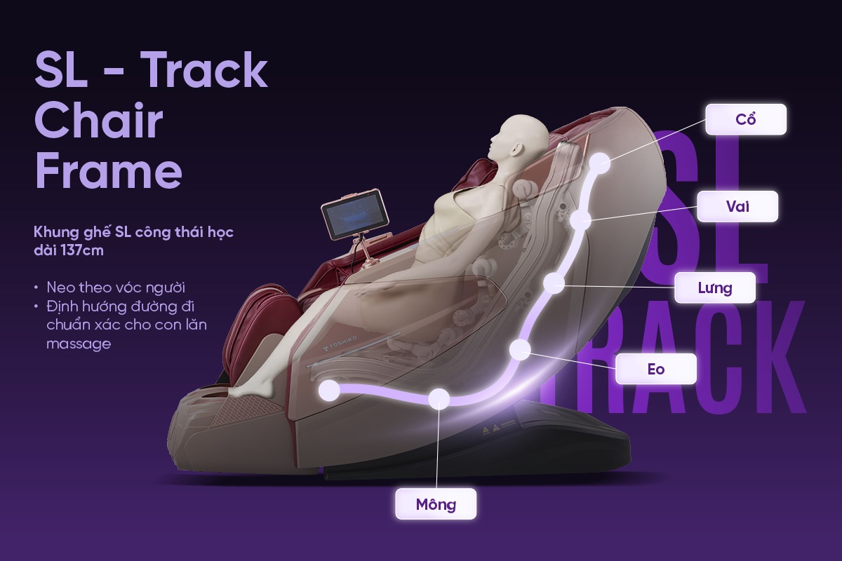 Khung SL-track dài vượt chuẩn 137cm, hỗ trợ con lăn chạy dọc liền mạch từ cổ - vai - lưng - eo - đùi. Thiết kế công thái học giúp nâng đỡ chuẩn theo cấu trúc xương sống, tăng hiệu quả trị liệu trên diện rộng, đồng thời cải thiện tư thế và lưu thông khí huyết toàn thân.